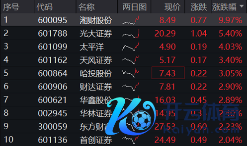板块个股中,湘财股份涨停封板,光大证券涨逾5%,太平洋涨超4%,天风证券、哈投股份双双涨超3%,财达证券、华鑫股份、东方资产、首创证券等涨幅居前。