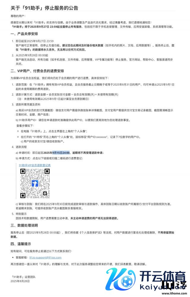 IT 之家 8 月 31 日音讯,经典苹果 iPhone / iPad 缔造贬责用具" 91 助手"发布公告,文书由于"业务退换及居品迭代优化需求"," 91 助手"将于 9 月 27 日 23:59(9 月 28 日)起全面罢手总共做事,包括但不限于手机相接贬责、文献传输、左右安设卸载、系统算帐等功能。