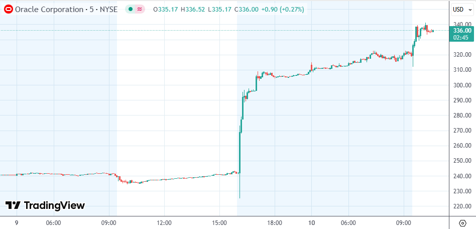 放胆发稿,甲骨文股价高涨近40%,盘中一度涨超41%;特斯拉涨幅略超1%。